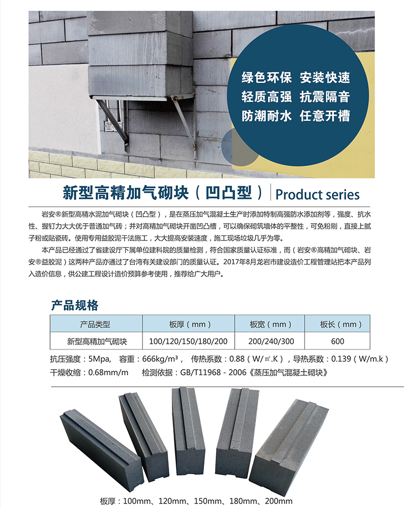 新型高精加氣砌塊凹凸槽設(shè)計(jì),安裝工藝簡單快速??扇我忾_槽(水電管線安裝方便)、切割調(diào)整寬度、長度,可在任意部位釘釘、鉆孔、安膨脹螺栓,單點(diǎn)吊掛力在50公斤以上。粘貼性強(qiáng),免再粉刷,可直接上膩?zhàn)?、貼瓷磚,大大縮短工期。